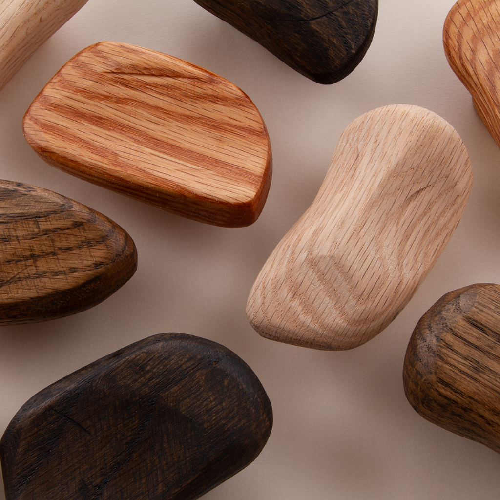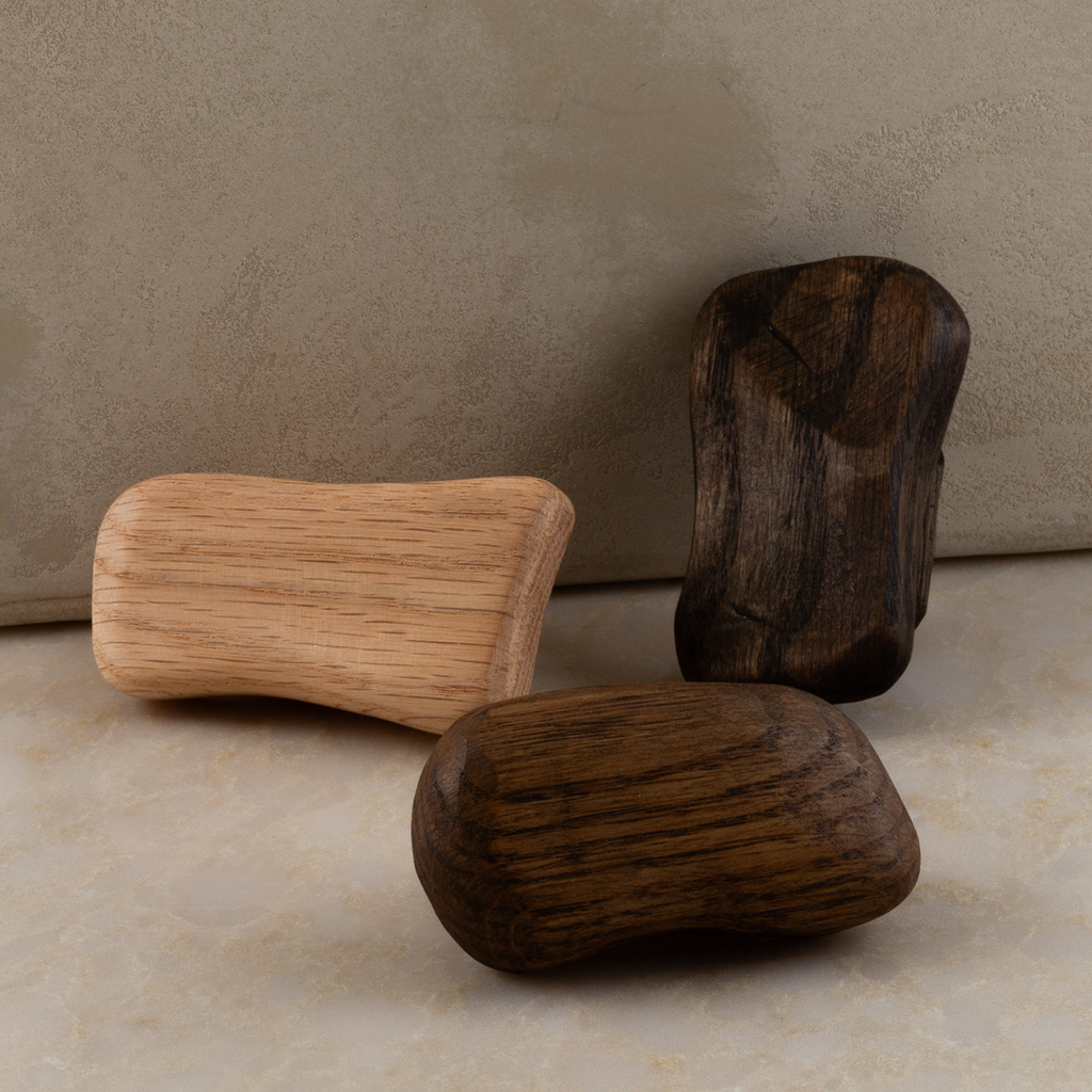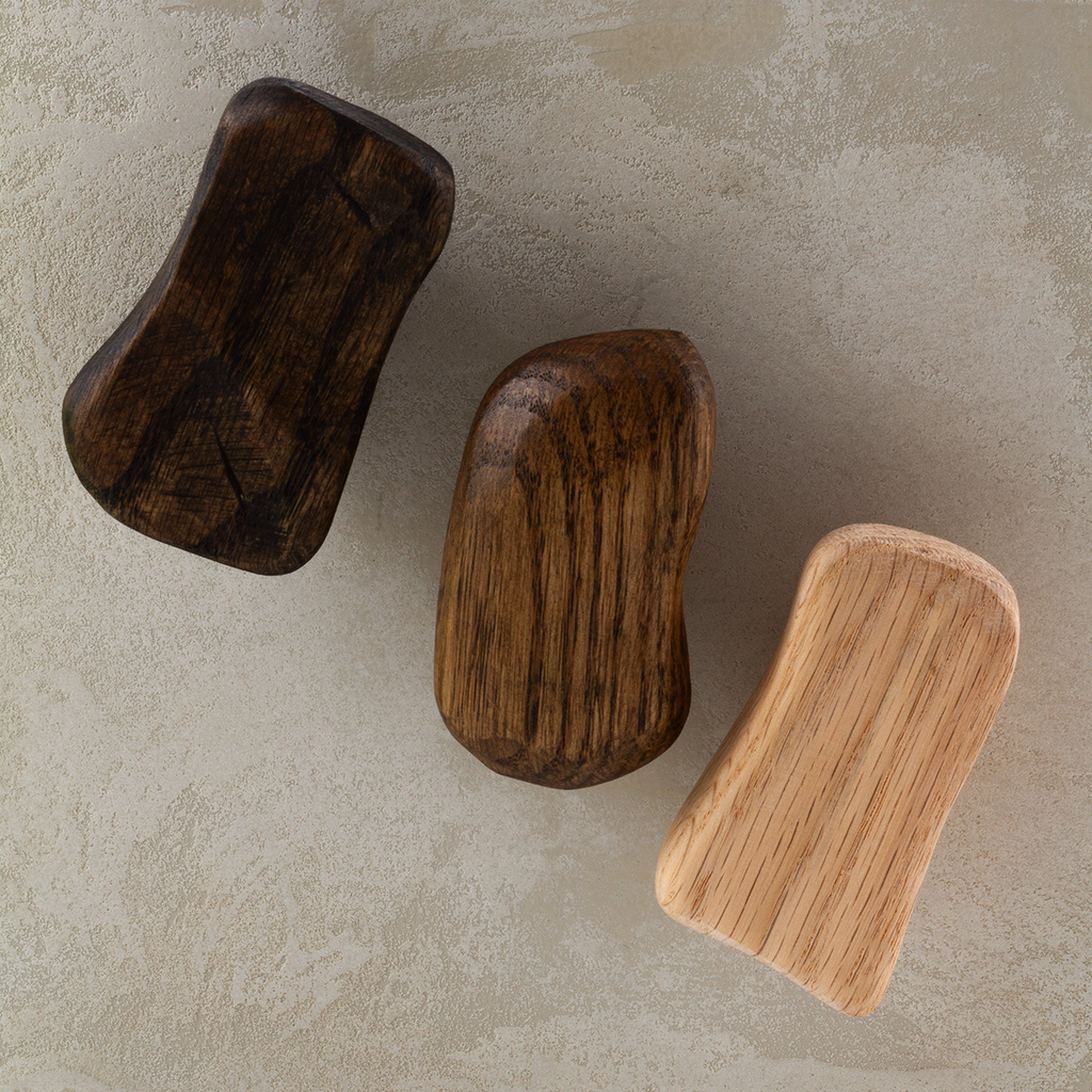 Crafted from upcycled American Oak, each knob is shaped, carved, and finished by hand, honouring the natural grain while giving new life to reclaimed timber. No two are ever the same, with every piece carrying its own personality, texture and story through subtle variations in form.